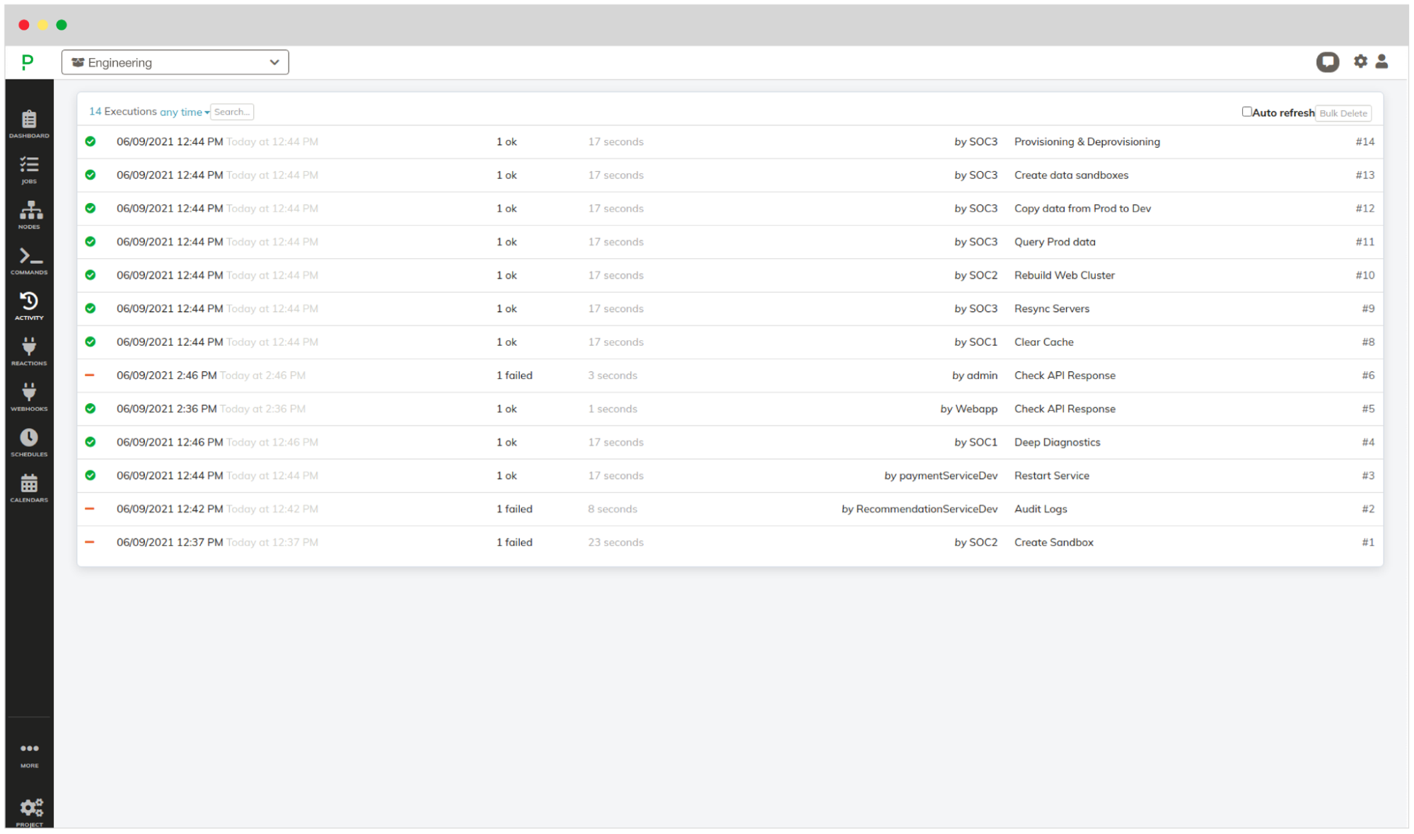 View the execution history for commands and Jobs. Execution detail for each job shows when the job was run with, log output, job duration, etc.